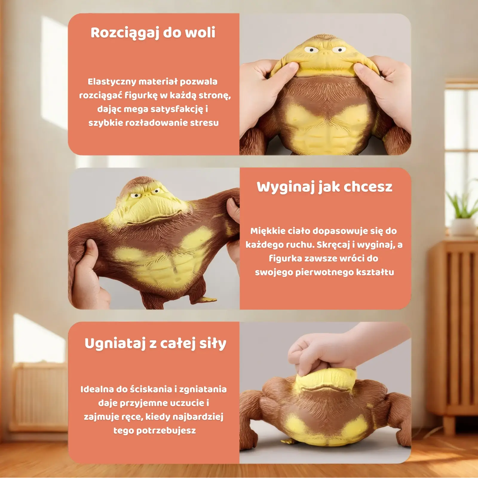 Gorly wytrzyma wszystko od ugniatania po rozciąganie. Jego elastyczne, miękkie ciało dopasowuje się do każdej zabawy, a potem wraca do pierwotnego kształtu. Dzięki temu zajmuje dłonie, wycisza głowę i daje natychmiastową ulgę, niezależnie od tego, jaki masz dzień.